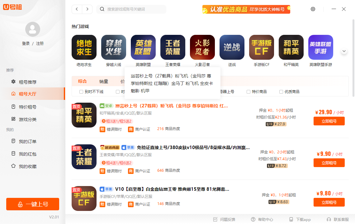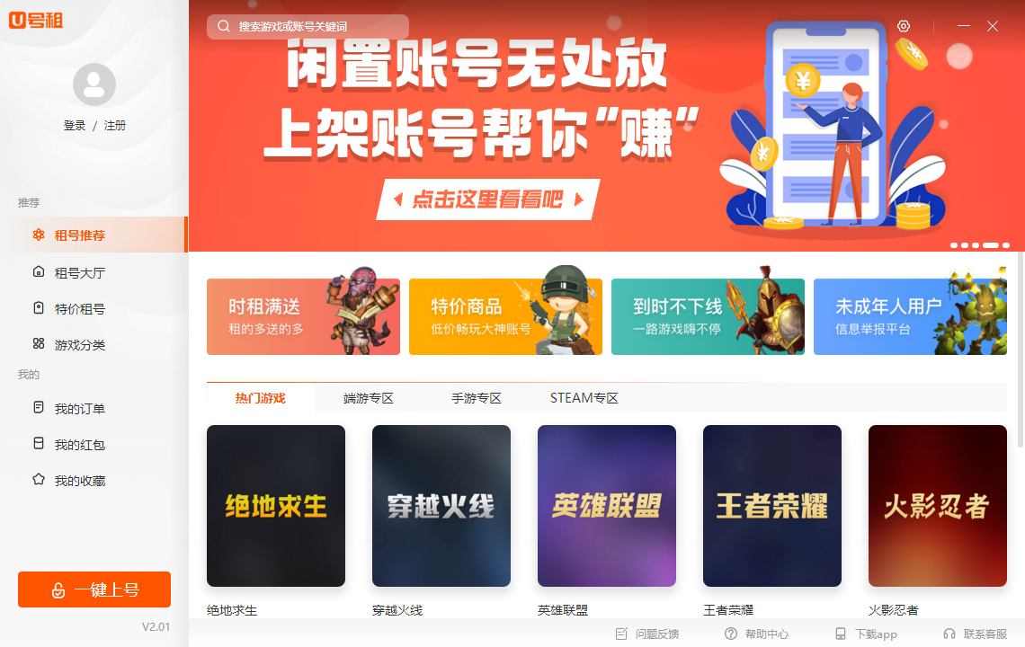 U号租从游戏账号租赁入手,为买家提供更多优质账号的选择,同时为卖家带来闲置账号的增值收益。u号租上号器里有大量不同等级的游戏账号可供玩家租赁,支持英雄联盟、绝地求生、CF等热门游戏。本站下载为您提供U号租电脑版官方版下载,U号租电脑版,U号租电脑版官网下载,U号租软件官方下载。